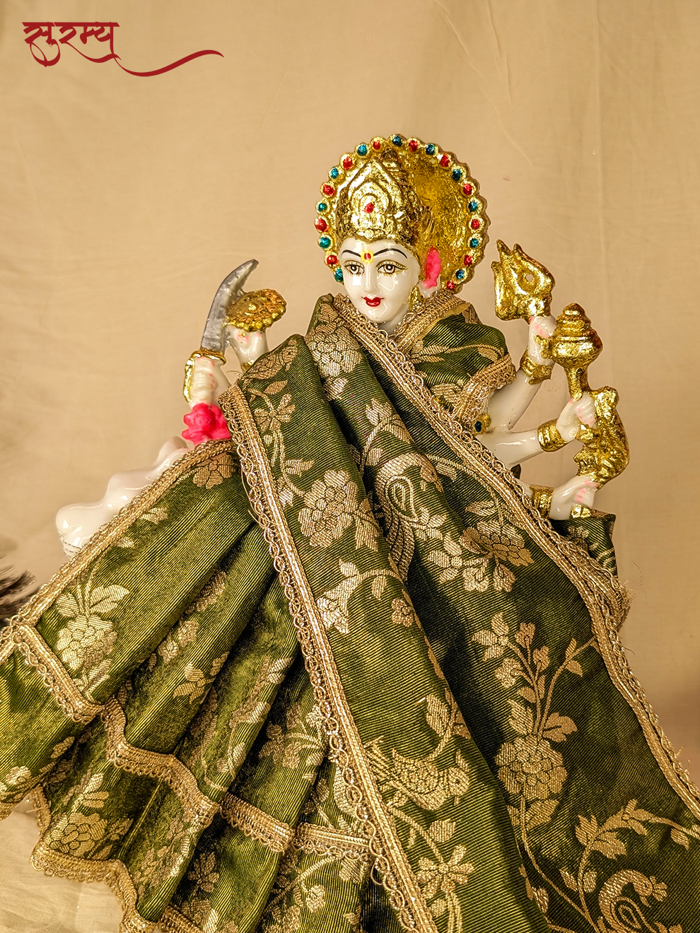 Mayura Kamal Saree | Green Silk Brocade Saree for Mata Rani Ji | Peacock and Floral Design | Laxmi Ji Saree